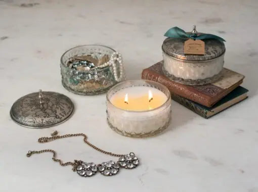 Antique powder puff boxes inspire our Botanical Floral Collection’s Camellia Japonica candle. The container is textured glass with a botanical-inspired engraved lid, finial, & hand-dyed silk ribbon.