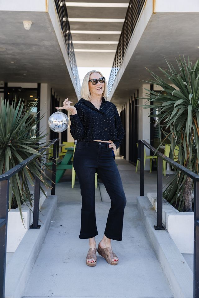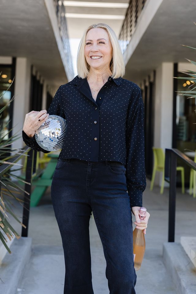 Meet the Lilith Rhinestone Top—your secret weapon for New Year's glamour. This black button-up features dazzling rhinestone details that catch the light with every move, making you the sparkle of any celebration. Long sleeves keep things sophisticated while the glittering embellishments add just the right amount of pizzazz. Dress it up for midnight toasts or down for festive daytime looks. When you want to shine without trying too hard, this top delivers the glam.