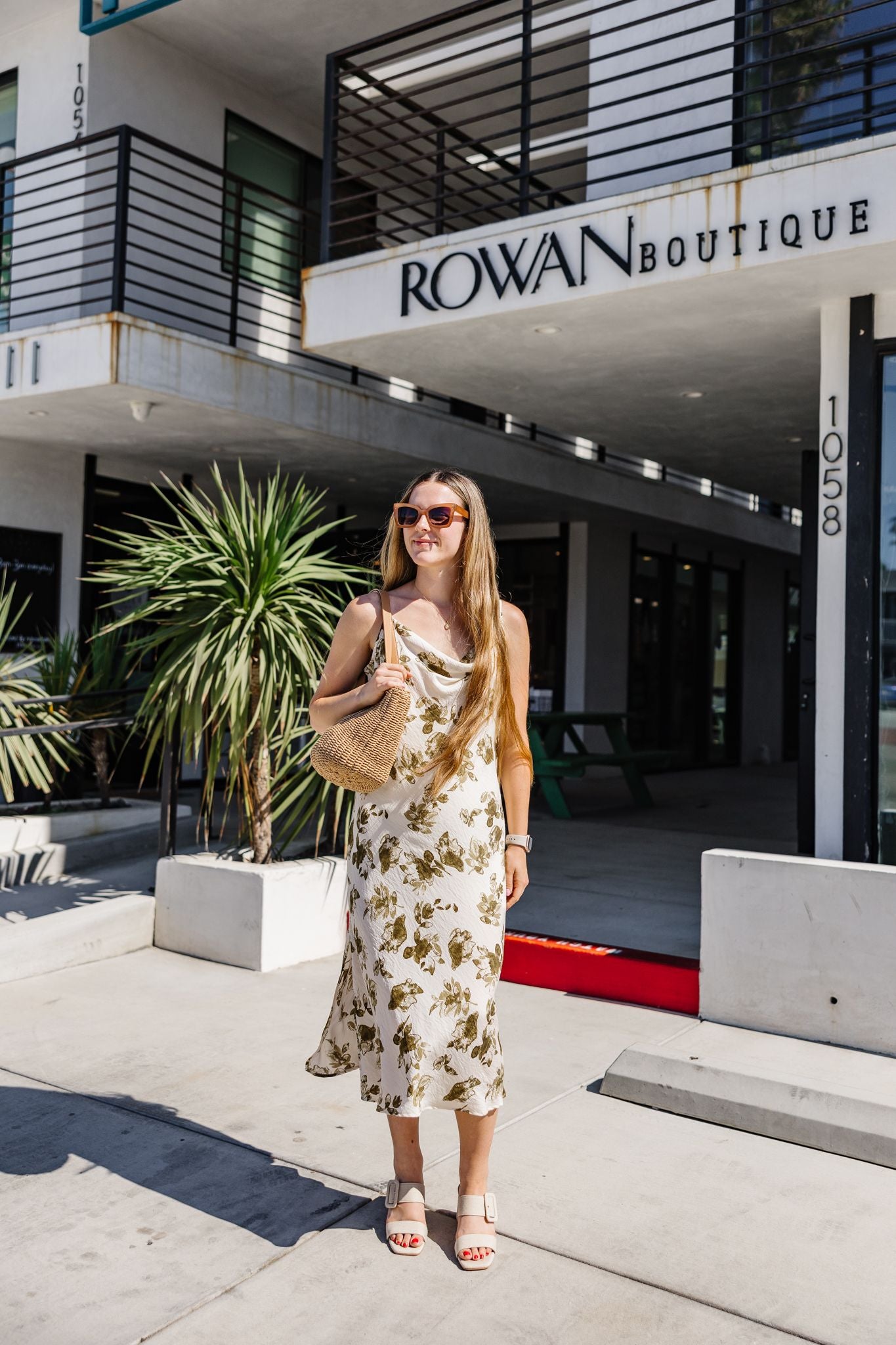 Cowl neck dress with an olive shrub design.